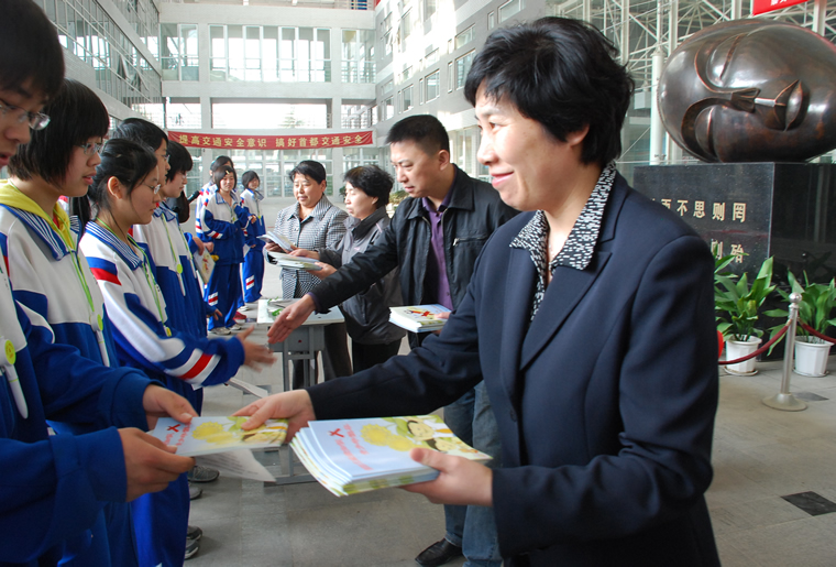 崇文区-向学生发放防治艾滋病宣传志愿者