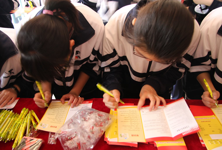 崇文区中学生在十进行动横幅上签字