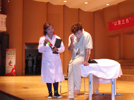 互动游戏后交流会正式开始。首先疾病预防控制中心刘主任致辞,他为大家介绍了国家防艾工作的进展,以及“以爱之名”主题创意大赛的总体情况和进度——从29日起,大赛专家组将对33万余件作品进行评奖;同时强调将“权益、责任、落实”作为今后防艾工作的主题和重点。其后,一位坚强乐观的艾滋病感染者为大家带来了一段VCR,讲述了他因艾滋而陷入痛苦的家庭与他积极投身防艾工作获得的收获。他的团队还制作了一幅巨型图画——《母亲的爱》,以此感谢家庭对艾滋病人的支持。接下来是由社区感染者带来的小品《雨夜》,讲述了一位艾滋病患者因遭歧视而欲自杀,经过主治医师的劝导,重新找到生活下去的勇气的故事。此小品极具震撼力、感染力,全场观众皆为之动容。随后进行的诗歌朗诵和观众互动活动,使大家身临其境地体会到消除歧视,平等相处的重要性。而在之后的访谈节目中,嘉宾周柳建成及艾滋病感染者接受了现场采访和观众提问,使大家更深刻地认识到艾滋病反歧视的重要性,也更加坚定了所有到场观众做好防艾宣传工作的信念。