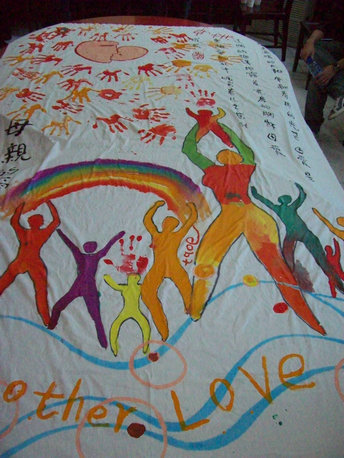 最后全场人员在爱心人士李老师的带动下,拿起画笔共同绘制出一幅以“母亲的爱”为主题的画作,并留下期望——赢得更多的社会大众对艾滋病感染者家庭的理解和关爱!有更多的母亲真心接纳和关爱自己的孩子!每个孩子都能更真诚地回报母亲的爱!