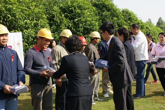10月30日,红丝带健康包广东发放启动仪式在广州市番禺区锦绣香江花园的建筑工地内举行。广东省工商联副巡视员方苹、副处长张小华,广东省艾滋病防治研究所所长林鹏、广东省人保厅农工处副处长邱?,中华红丝带基金副秘书长叶大伟、香江社会救助基金会秘书长程瑶等出席了此次启动仪式。