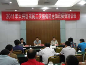 为了落实《大兴区艾滋病综合防治示范区工作方案(2009-2013)》的相关工作要求,大兴区疾控中心于2011年5月20日下午举办了“大兴区农民工艾滋病防治知识师资培训班”,区卫生局法制防治科王艳颖科长、区住房与建设委员会监督站李伟书记以及28家建筑工地33名负责人参加了此次培训。