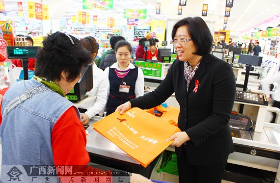 “来,拿个购物袋吧!”近日,到南宁市南城百货购物的市民发现,在结账处,服务员都会提供一个免费的购物袋,上面印有象征防治艾滋病的红丝带标志和“人人预防 天天健康”的字样。