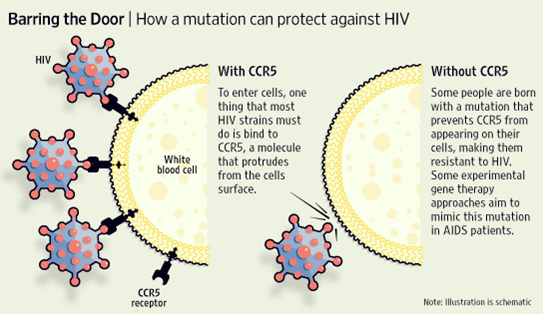 人类细胞上的一个细胞受体CCR5,是艾滋病毒的结合受体,通过这个受体艾滋病毒才能结合到人类细胞上,当CCR5受体发生变异时,HIV病毒则无法进入细胞进行复制,长期在细胞外将死亡。