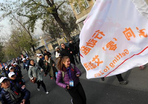 12月1日,外国友人和医务工作者在接力慢跑活动中。当日是第25个“世界艾滋病日”。北京举办了“行动起来 向‘零’艾滋迈进”——艾滋病防治宣传“防艾无国界”接力慢跑活动。部分医务工作者、大学生志愿者、社区居民以及国际友人代表共同完成接力跑,并签名承诺携手“防艾”。新华社记者 公磊 摄