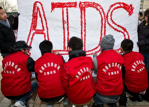 12月1日,来自天津艾滋病民间关爱机构“艾馨家园”的成员用小红丝带拼贴出“AIDS”的字样。当日,来自天津各高校的大学生志愿者在时代未来广场举行世界艾滋病日宣传活动,通过发放宣传材料、设置问答题等形式多样的活动唤起市民对艾滋病人的关爱、理解和尊重,呼吁全体市民共同行动,预防艾滋病。新华社记者 岳月伟 摄
