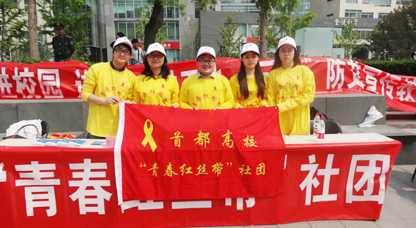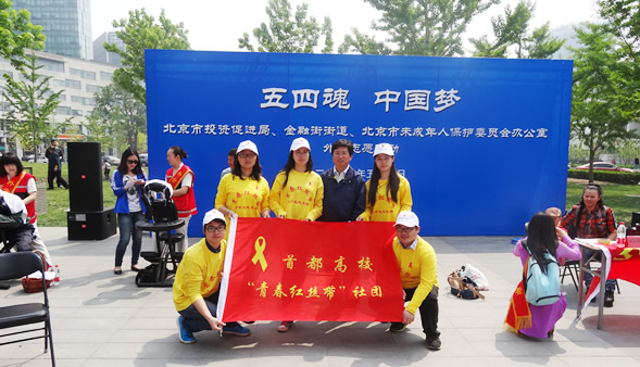 5月4日上午,首都高校青春红丝带社团工作领导小组办公室(北京市青少年法律与心理咨询服务中心)组织中国地质大学、北京联合大学、北京城市学院志愿者来到北京市西城区金融街,开展“青春红丝带”——进社区 进企业 进工地防艾宣传教育活动。