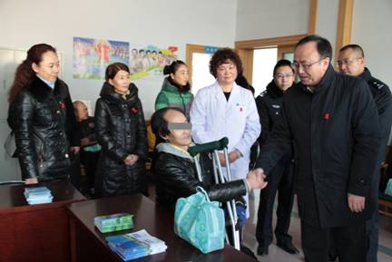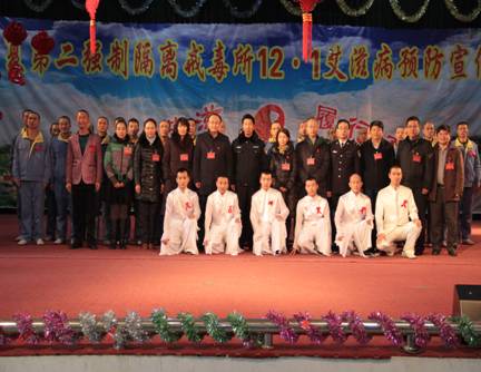 12月1日上午,宁夏回族自治区卫生厅田丰年副厅长、疾控处张波处长和自治区疾控中心李丽主任等领导前往自治区公安厅安康医院美沙酮门诊,听取了门诊工作人员工作情况的介绍,亲切慰问了参加美沙酮维持治疗的艾滋病感染者和病人,田副厅长握住感染者的手,鼓励他们树立生活的信心,学会科学对待疾病,坚持吃药,安心治病。并对门诊在有效遏制艾滋病传播、减少毒品犯罪、维护社会稳定、构建和谐社会等方面发挥的作用给予了肯定。随后田丰年副厅长一行来到宁夏第二男子强制隔离戒毒所与银川市、兴庆区各级领导观看了由戒毒学员们表演的舞蹈《舞动的红丝带》、手语操《国家》和独唱《拯救灵魂的港湾》等艾滋病防治宣传节目,内容精彩,形式多样,同时穿插着艾滋病防治知识有奖竞答,学员们踊跃抢答,互动频繁,对预防艾滋病传播进行了生动活泼的宣传,受到了大家的热烈欢迎。最后田副厅长等人来到光明广场,参加兴庆区艾滋病综合防治领导小组主办、兴庆区疾控中心与宁夏广电总台联合承办的“飘扬的红丝带,你我同参与”现场直播大型公益宣传活动,并视察自治区、银川市、兴庆区等卫生医疗单位组织的文艺演出、千余人志愿者方队抗艾宣誓及签名、有奖知识问答等宣传活动。