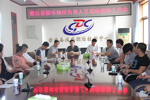 为落实《北京市2015年艾滋病防治工作要点》精神,提高歌厅负责人对艾滋病干预工作的认识,保障干预工作质量,密云县疾控中心与密云县文委于2015年5月25日14:00在疾控中心四层会议室召开了“密云县娱乐场所负责人艾滋病防治工作会”。