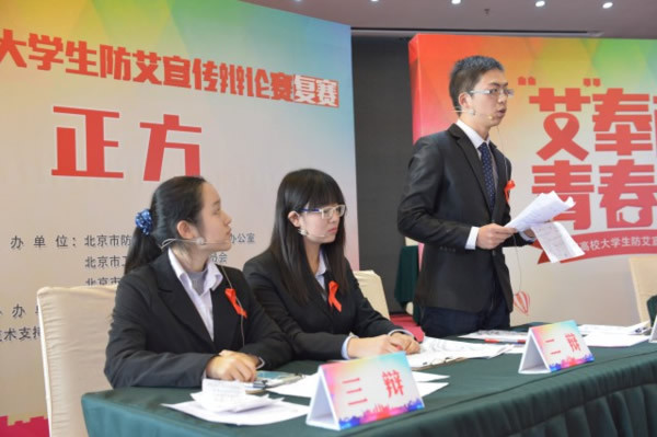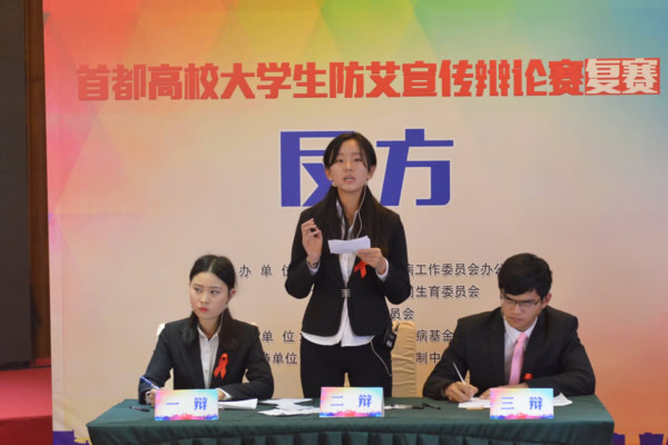 竞赛现场邀请中央民族大学老师,李依霖博士担任辩论主席,在有序的组织工作下,24支参赛队唇枪舌剑,言辞流利,宣传防艾知识,展示防艾观点,一场场精彩辩论席卷而来。
