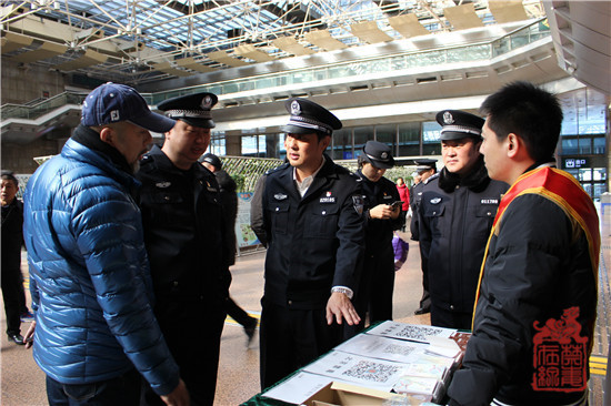2月9日,北京市禁毒办、市公安局禁毒总队、市铁路公安局等相关领导及工作人员带领志愿者在北京西站、北京南站候车厅向广大旅客宣传毒品危害知识,发放禁毒宣传品。禁毒志愿者对照仿真毒品模型向现场群众讲解各类毒品的构成及成瘾原理,并对群众提出的问题认真详实的逐个解答。现场群众积极通过手机扫描“中国禁毒”和“北京禁毒”二维码加关注的方式获赠禁毒宣传品的环节,使活动达到高潮。