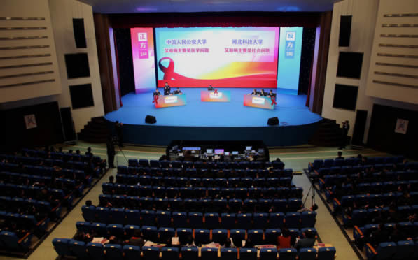 11月25日,在中国人民公安大学举行了辩论赛的决赛。国务院防治艾滋病工作委员会办公室副主任,国家卫生计生委疾控局副局长夏刚;国务院防治艾滋病工作委员会办公室主任助理、中国疾病预防控制中心性病艾滋病预防控制中心主任韩孟杰;天津市重点疾病预防控制和免疫规划工作领导小组办公室主任、天津市卫生计生委副主任王栩冬;河北省防治艾滋病工作委员会办公室主任、河北省卫生计生委党组成员、河北省中医药管理局局长姜建明;中国预防性病艾滋病基金会理事长王玉民(少将),以及来自北京市、天津市和河北省卫生计生委、教委、疾病预防控制中心、北京性病艾滋病防治协会、首都高校青春红丝带社团领导小组的领导、嘉宾及高校大学生共计500余人参加了此次活动。中国预防性病艾滋病基金会红丝带大使杨鹤城主任通过生动形象的表演为防艾控艾事业贡献出自己的一份力量。