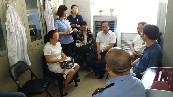 区卫计委疾控科副科长王薇、区禁毒大队政委汪海涛、区禁毒大队办公室主任尚超、区食药局食药科科长宋宏宇,区疾控中心副主任邢彦参加了此次督导活动。邢彦副主任对美沙酮门诊工作进行了详细汇报,门诊同药监、禁毒办、花园路派出所建立了沟通联动机制,同时对他们给予门诊大力支持表示感谢。此次督导主要检查了门诊的相关工作制度,药库账目管理、门诊安全保障措施、药品日常管理、监控升级改造及病人治疗病例情况等。