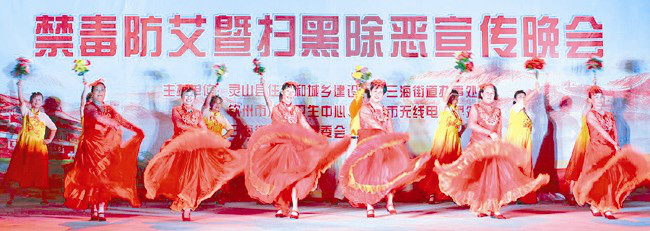 当天来自多个村、社区的文艺队共18个歌舞节目为广大群众带来一场视听盛宴,舞蹈《歌唱祖国》喜庆欢乐,点燃了现场观众的热情;一出小品《戒毒》让在场的观众无不深刻了解毒品对家庭的危害;一场快板《扫黑除恶红旗展》朗朗上口,赢得了现场观众的阵阵掌声。晚会还设有禁毒防艾、扫黑除恶知识有奖问答活动,主持人与观众亲切互动,观众们踊跃参与,整台演出采取群众喜闻乐见的方式,寓教于乐、赏心悦目,弘扬新风正气,激发了广大群众广泛积极参与禁毒防艾、扫黑除恶的热情,壮大了专项斗争的声势,营造出“家喻户晓、人人皆知、全面参与”专项斗争的浓厚氛围,为平安三海建设创造良好环境。