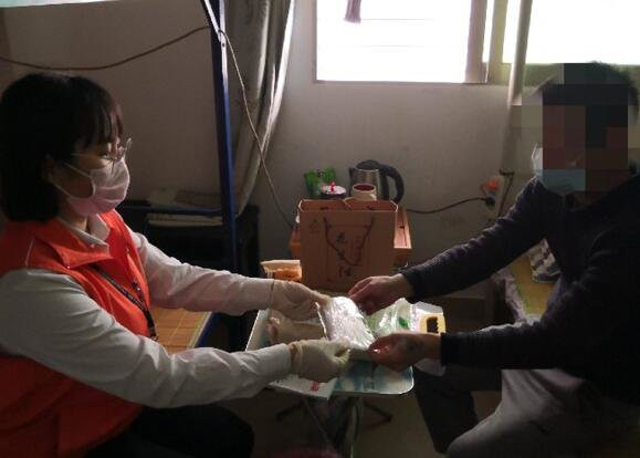 2月13日,深圳市宝安区西乡街道禁毒办工作人员为戒毒康复人员小袁送上口罩及生活用品。中国禁毒网发