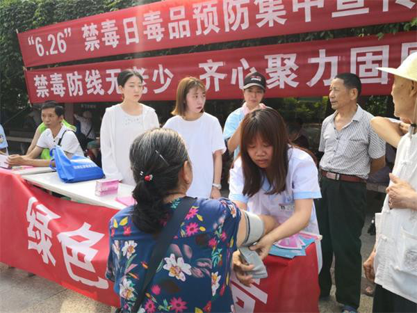 在沿滩区宣传点,多种多样的宣传形式引来众多市民驻足观看;冒着高温,来自沿滩区妇幼保健院的杜良群,热情的接待着每一名前来咨询的市民,为他们体检义诊的同时,不失时机的宣传禁毒防艾知识。