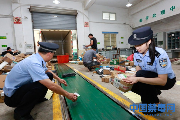 6月23日,浙江省舟山市岱山县邮政快递公司,禁毒大队民警在快递包裹上贴禁毒宣传单。邹训永 摄 当日,浙江省舟山市岱山县公安局禁毒大队民警联合当地快递公司组织开展以“健康人生、无毒家园”为主题的禁毒宣传活动。中国禁毒网发