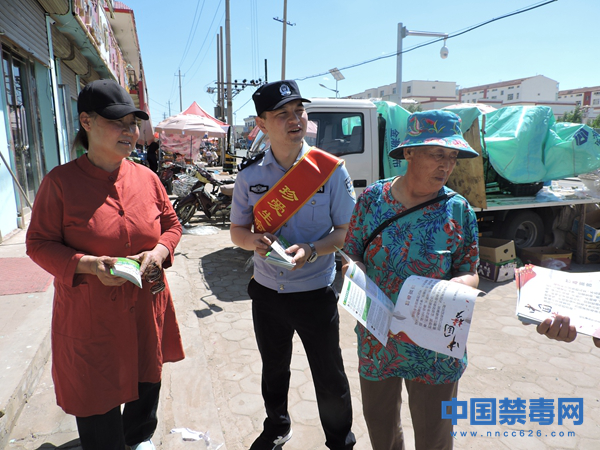 图为禁毒民警向群众讲解禁毒宣传册。中国禁毒网发
