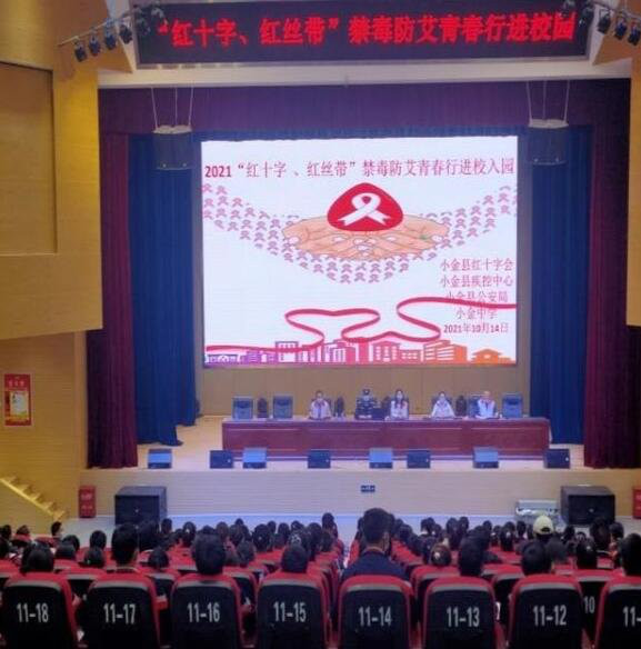 为进一步净化校园环境, 加强对在校学生的禁毒、防艾宣传教育,提高青少年识毒、防毒、拒毒和防艾意识,抵制吸毒低龄化,10月14日下午,县红十字会联小金县中学、县公安局及县疾控中心在小金县中学开展2021年“红十字、红丝带”禁毒防艾青春行进校园活动。