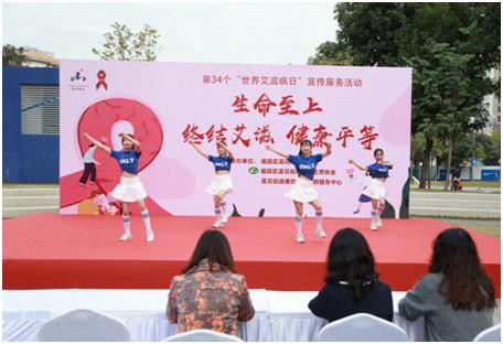 本次活动分为两大部分,第一部分为防艾主题文艺汇演,节目包含舞蹈《生命之舞》、相声《讲卫生的爱》、健身操舞《走进你心里》、魔术《见证奇迹》、独唱《健康幸福的中国》、丝巾舞《走进春节》等,期间穿插互动问答,台下居民踊跃参与,积极学习防艾控艾知识。