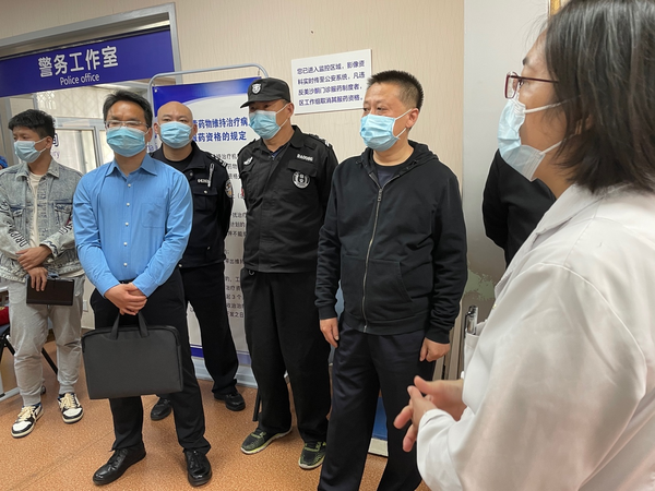 在疫情防控局势严峻环境下,为保障社区药物维持治疗工作有序开展,2022年4月19日,由北京市禁毒总队刘辉副总队长带队,北京市禁毒办督导组对丰台区美沙酮药物维持治疗第七门诊进行了督导检查。本次督导通过参观美沙酮门诊、听取汇报、座谈等方式,对社区药物维持治疗工作及疫情防控措施落实情况进行了深入了解,北京市禁毒办副大队长王愚福、北京市禁毒总队大队长李晓东、丰台区禁毒办李伟副主任、高静副大队长、石榴园派出所副所长聂轶旸、区卫健委疾控科科员陈非、区疾控中心艾防科副科长李彦奇、蒲黄榆社区卫生服务中心党支部书记常青、第七门诊负责人胡翠华及相关工作人员陪同。