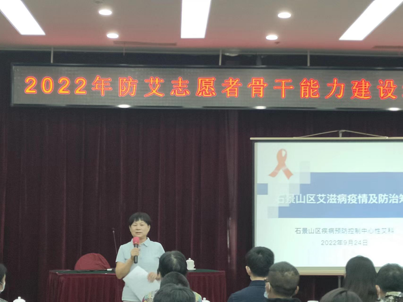 培训首先由石景山区疾控中心性病艾滋病防治科张国磊科长通过对区域艾滋病疫情分析、哨点检测情况、HIV抗体检测情况;艾滋病相关知识:艾滋病的定义、病原学、艾滋病病程进展、HIV存在的部位、传染源、传播途径、如何控制艾滋病传播、高危人群、窗口期、艾滋病病毒感染人体后症状、需要进行检测的人群、去哪里检测HIV、性病与艾滋病的关系等内容进行了分析及讲解。