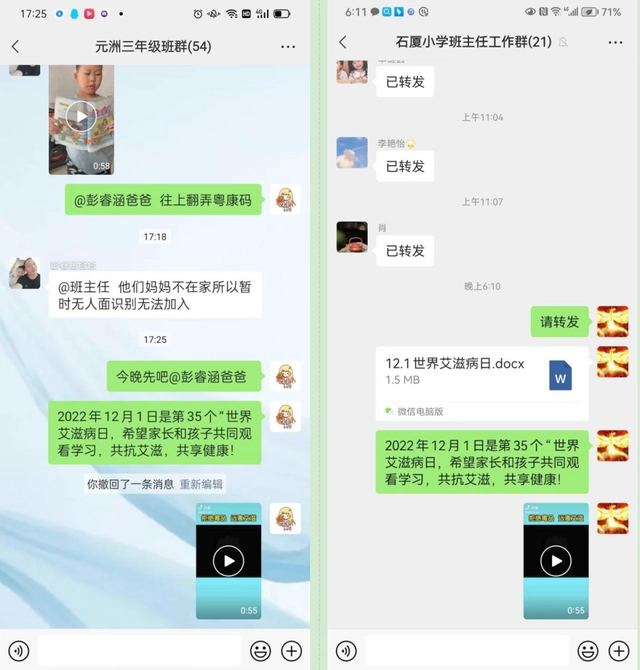 活动利用微信家长群为平台,各校老师通过转发预防艾滋病知识与防艾视频的知识链接到微信群中,让学生、家长、老师通过线上共同学习,让其更深入地了解预防艾滋病的重要性。虽然有些学生年龄尚小,对艾滋病的概念很模糊,但通过此次活动的开展,使学生们初步了解到吸毒是艾滋病的传播途径之一,要树立健康生活方式,远离毒品。大力倡导大家要建立文明健康的生活方式,让更多的人了解到艾滋病与毒品的相关联系,防范艾滋病的传播。