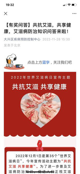 2022年12月1日是第35个世界艾滋病日,今年的宣传主题是“共抗艾滋 共享健康”。为进一步普及艾滋病防治知识,促进人们正视艾滋病、关注艾滋病,提高预防艾滋病的意识,2022年11月29日-12月1日,大兴区疾控中心通过微信公众号发起为期三天的“共抗艾滋,共享健康,艾滋病防治知识有奖问答”活动。