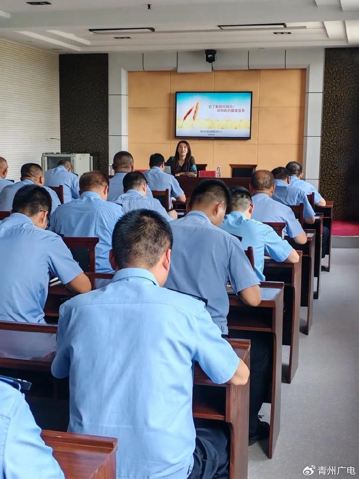 6月6日上午,青州市疾控中心工作人员到青州市看守所开展艾滋病和结核病防治知识讲座,中心相关科室人员对看守所全体民警辅警从艾滋病和结核病传播途径、预防措施及职业暴露后的预防性用药等几个方面进行了系统的讲解,与公安干警面对面的进行交流和讨论在工作中遇到的各种特殊情况的处理,看守所大队班子成员、办公室工作人员及管教民警参加了本次培训。
