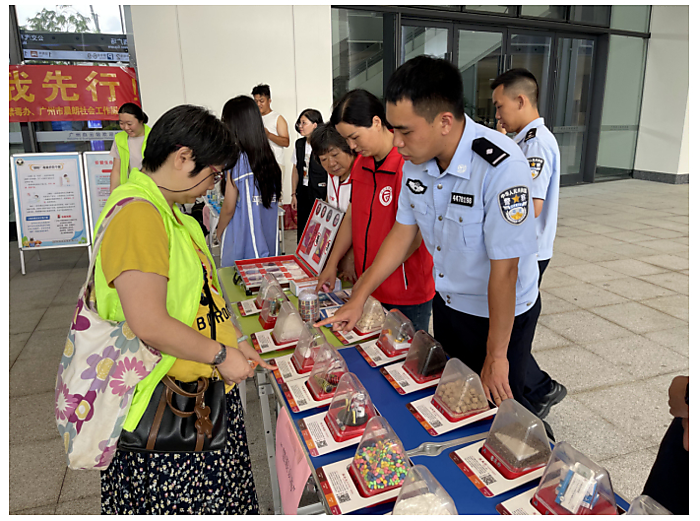 活动现场设置了多个互动展区,将禁毒宣传与趣味游戏相结合。在"慧眼识毒"区中:禁毒民警现场揭秘"奶茶粉""跳跳糖"等新型毒品伪装术,结合仿真模型剖析依托咪酯、右美沙芬的危害,重点提醒青少年和外出务工人员尤其要提高警惕;展区二为精准打击(保龄球游戏):市民用贴有毒品名称的保龄球瓶开展趣味对抗,两次全中即可通关;展区三为禁毒知识大比拼:涵盖法律法规与防毒技巧的闯关答题引发群众热烈讨论;展区四我是禁毒宣传员:市民手持禁毒标语牌与广东禁毒吉祥物"粤虎"合影,分享朋友圈传递正能量;最后展区五为反馈兑奖区:参与者在填写意见表的同时兑换定制禁毒宣传品,让市民在参与中强化识毒、防毒意识。